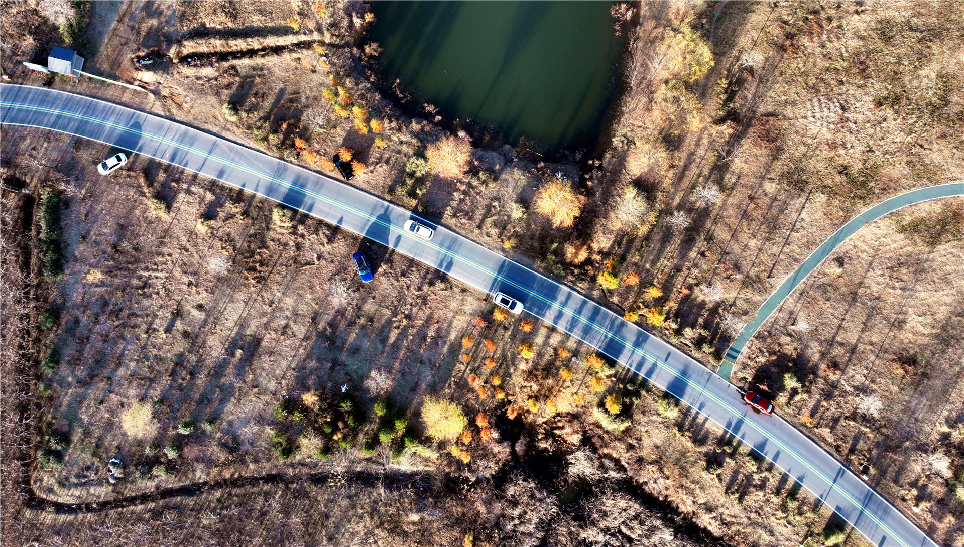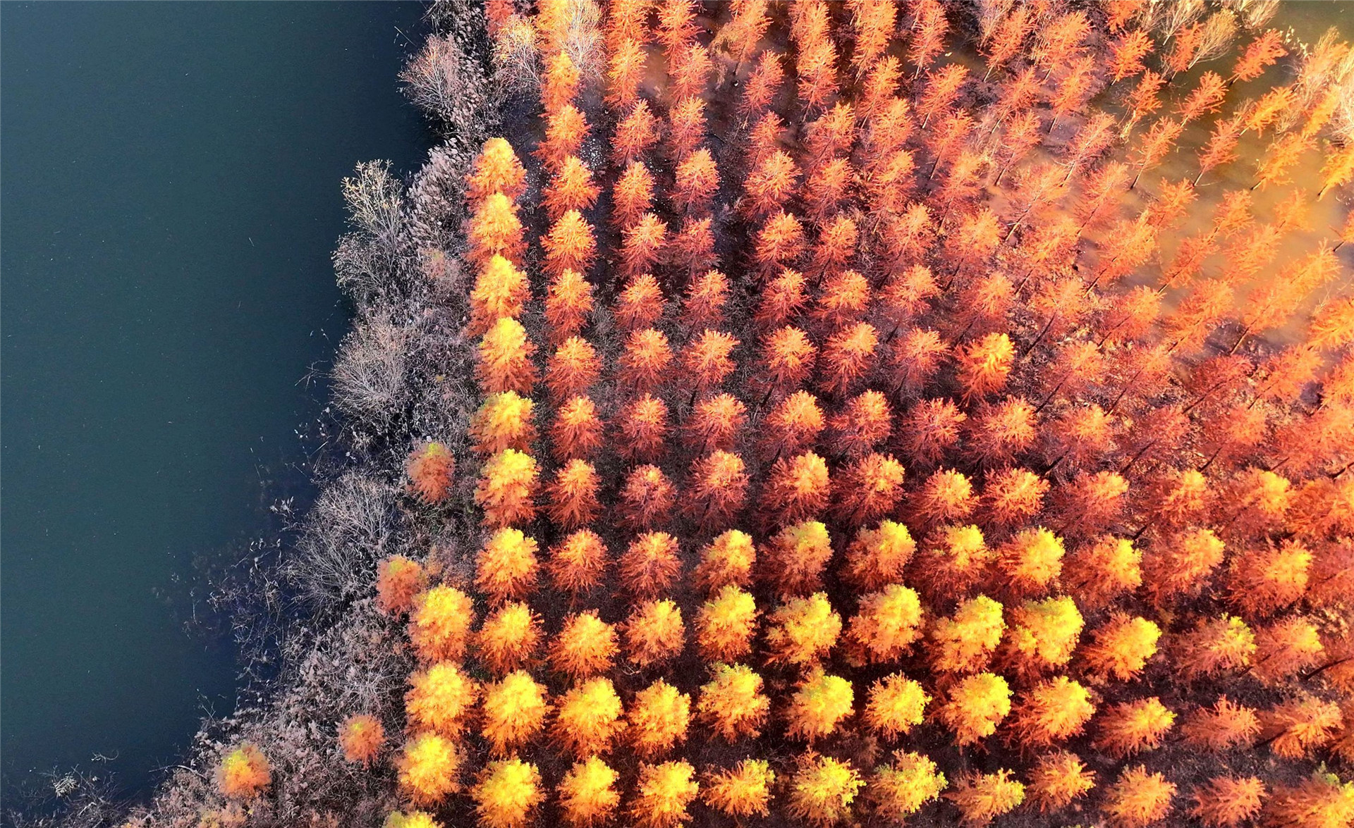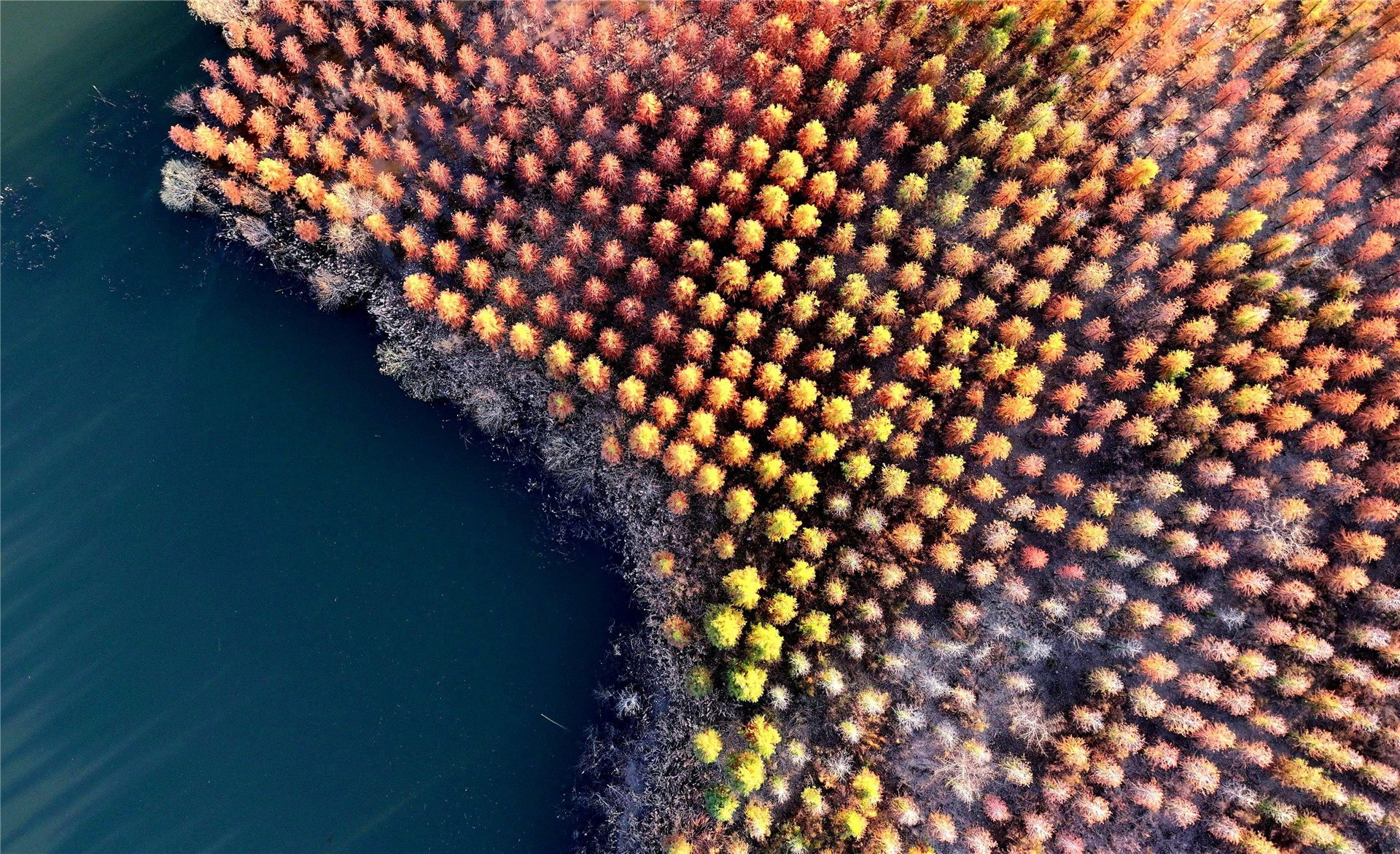 12月15日,用無人機俯瞰洛陽市孟津區白鶴鎮萬羽洲黃河濕地公園,藍天白云與清澈碧綠的滔滔河水、五顏六色的濕地植被、蜿蜒通暢的生態廊道等相映成景,處處呈現出五彩斑斕、如詩如畫的壯美畫卷,吸引大批游客前來休閑游玩。