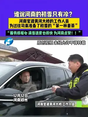 12月12日,河南鄭州。誰說河南的初雪只有冷?河南官渡黃河大橋的工作人員,為過往司乘準備了初雪的“第一杯姜茶”。“服務很暖心,清雪速度也很快,為河南點贊!!”