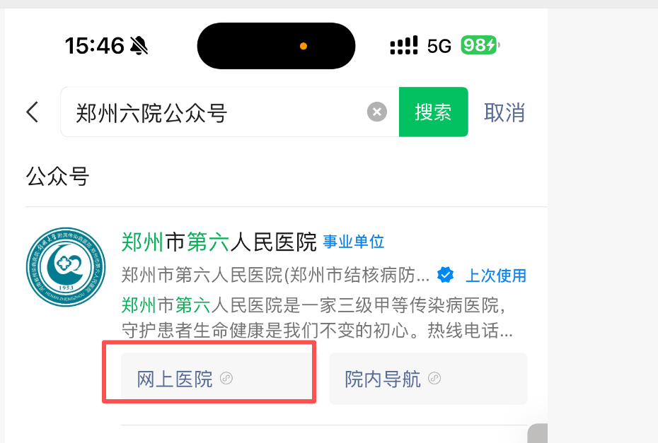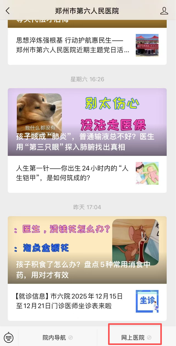 搜索“鄭州六院公眾號”,點擊“網上醫院”