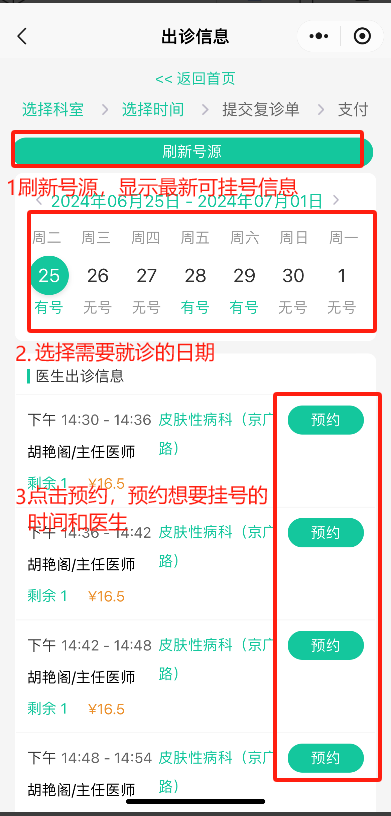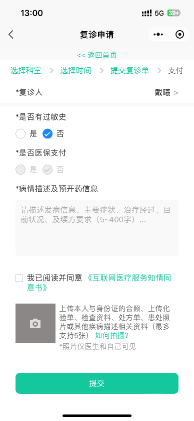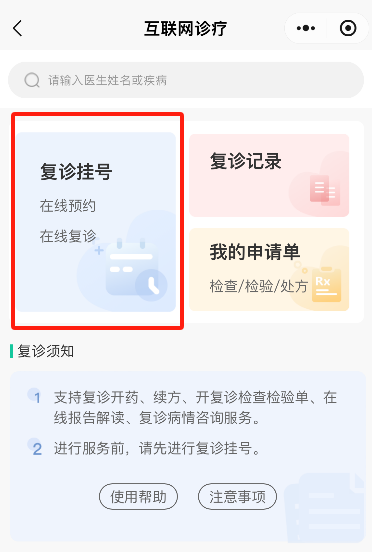 選擇首頁【在線復診】服務?選擇【復診掛號】?選擇要掛號的科室?選擇對應時間段的大夫?填寫復診信息、上傳報告單圖片等?支付掛號費