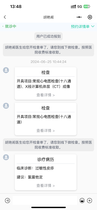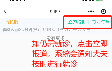 預約掛號支付后,自動跳轉到互聯網醫院線上診室,等到預約時間到后,點擊立即報到