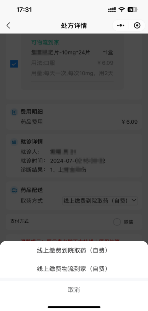 選擇“互聯網處方”?選擇待支付的處方?處方詳情界面,點擊自費支付,選擇到院取藥或者郵寄