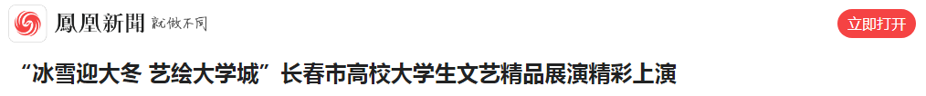 鳳凰網推出《“冰雪迎大冬 藝繪大學城”長春市高校大學生文藝精品展演精彩上演》,報道12月14日晚,“冰雪迎大冬 藝繪大學城”——長春市高校大學生文藝精品展演在長春市群眾藝術館劇場精彩上演。整場晚會涵蓋歌舞、器樂、語言等多種藝術形式,借助多媒體與舞臺特效,打造出一臺兼具主題性、藝術性與校園特色的高水平文藝演出。