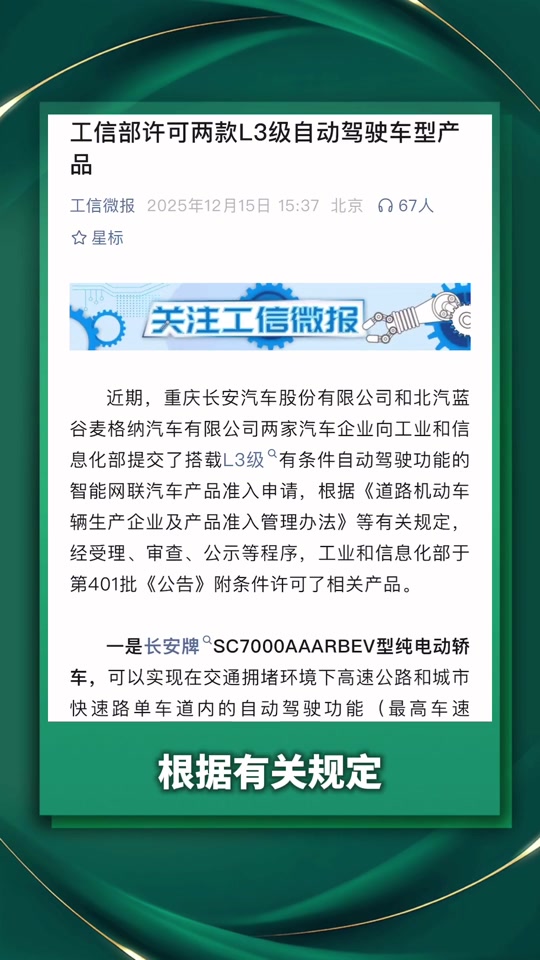 工信部表示,重慶長安汽車股份有限公司和北汽藍谷麥格納汽車有限公司向工信部提交了搭載L3級有條件自動駕駛功能的智能網聯汽車產品準入申請,根據相關規定,工信部附條件許可了相關產品。