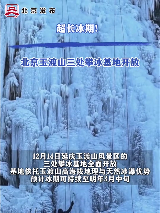 昨天,延慶玉渡山風景區的三處攀冰基地全面開放。基地依托玉渡山高海拔地理與天然冰瀑優勢,預計冰期可持續至明年3月中旬。