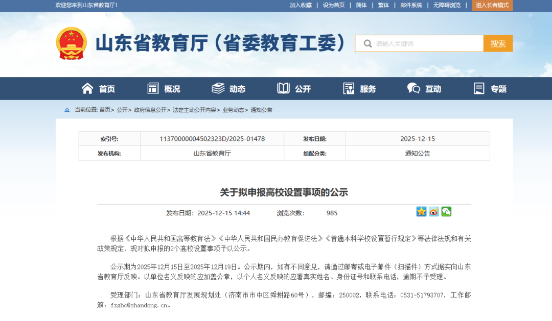 12月15日,山東省教育廳發布關于擬申報高校設置事項的公示。根據《中華人民共和國高等教育法》《中華人民共和國民辦教育促進法》《普通本科學校設置暫行規定》等法律法規和有關政策規定,現對擬申報的2個高校設置事項予以公示。