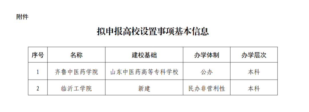 公示提到,擬以山東中醫藥高等??茖W校為基礎設立齊魯中醫藥學院,擬新建臨沂工學院。