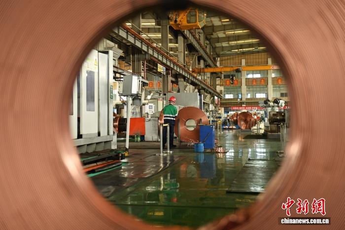 金川鎳都實(shí)業(yè)有限公司異型銅帶生產(chǎn)車間內(nèi),工作人員進(jìn)行異型銅帶軋制作業(yè)。(資料圖)李亞龍 攝