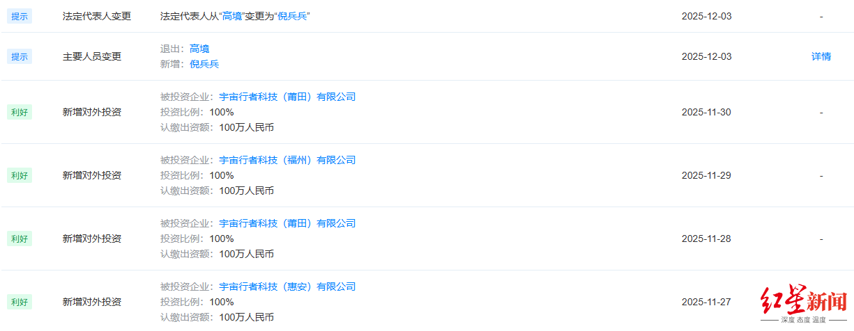 紅星資本局注意到,從11月27日到11月30日,宇宙行者新增了多筆對(duì)外投資,對(duì)惠安、莆田、福州三家全資子分公司的認(rèn)繳出資額均為100萬(wàn)人民幣。12月3日,執(zhí)行公司事務(wù)的董事,經(jīng)理高境退出,由倪兵兵接任。公司法定代表人由高境變更為倪兵兵。