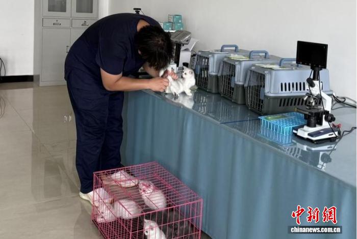 東北亞寵物交易中心工作人員正在給貓咪做檢疫。蘇家屯區(qū)委宣傳部供圖