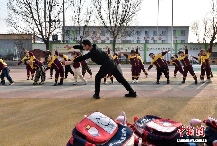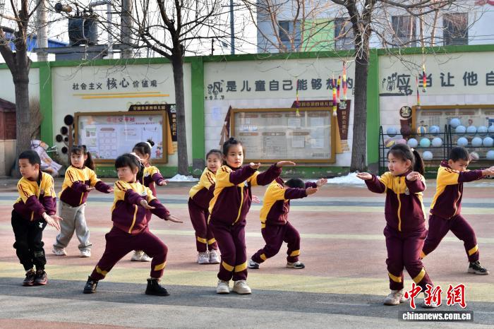 12月15日,河北省安國市第四幼兒園操場,老師帶著孩子們練習五禽戲。中新社記者 翟羽佳 攝