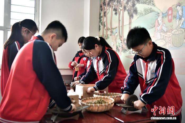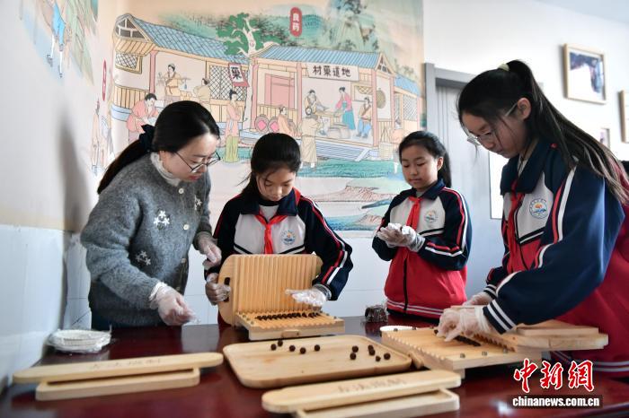 12月15日,河北省安國市實驗小學中醫藥養生體驗室,學生制作艾條和香囊。中新社記者 翟羽佳 攝