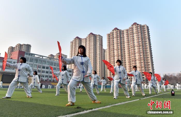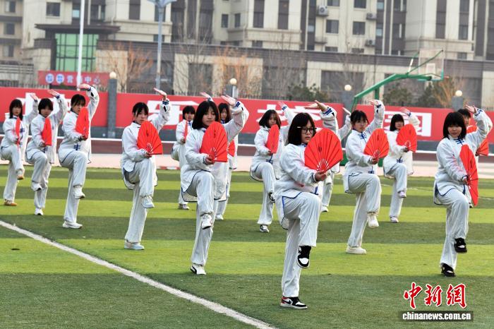 12月15日,河北省安國市關漢卿中學操場,學生們正在練習太極扇。中新社記者 翟羽佳 攝