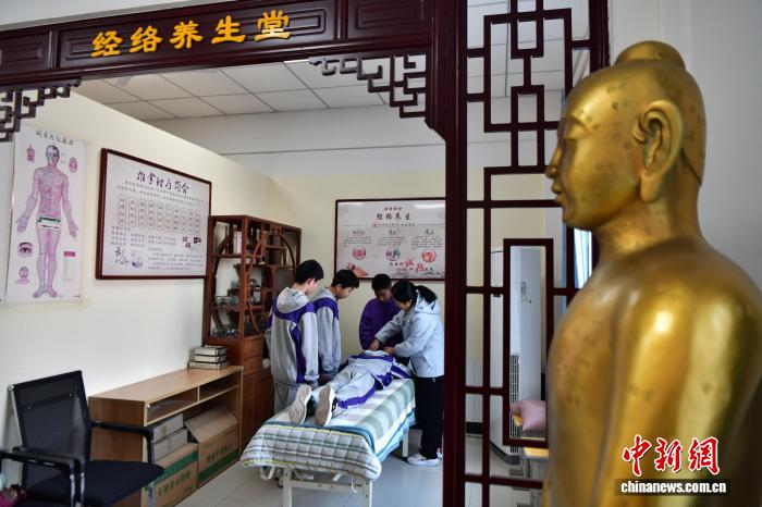 12月15日,河北省安國市實驗中學經絡養生堂,老師教授學生辨識穴位。中新社記者 翟羽佳 攝