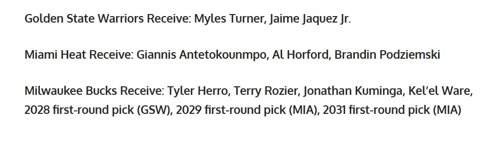 雄鹿得到:希羅+羅齊爾+庫明加+凱爾韋爾+28年勇士首輪+29年熱火首輪+31年熱火首輪。