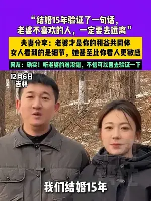 12月6日吉林,“結(jié)婚15年驗證了一句話,老婆不喜歡的人,一定要去遠(yuǎn)離”夫妻分享:老婆才是你的利益共同體,女人看到的是細(xì)節(jié),她甚至比你看人更敏感,網(wǎng)友:確實!聽老婆的準(zhǔn)沒錯,不信可以回去驗證一下 (來源:@一只幸運 )
