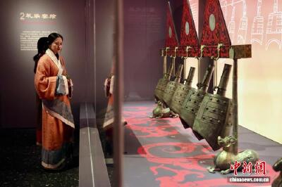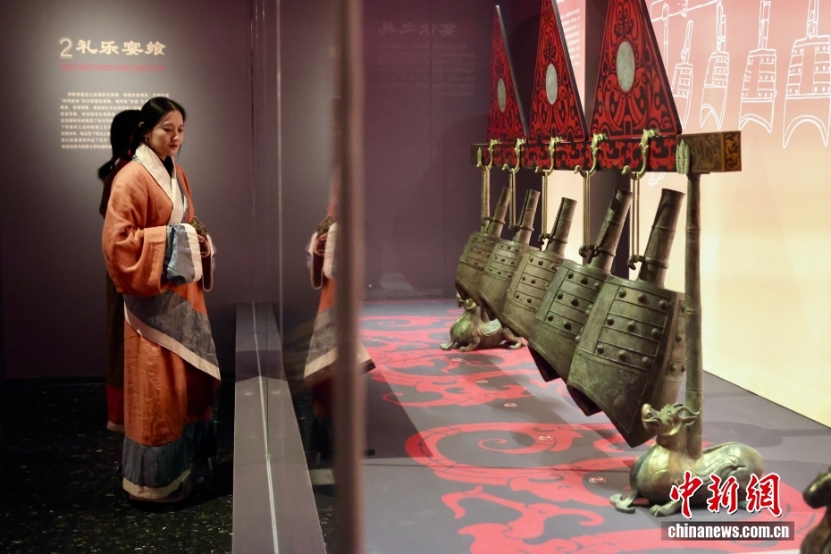 12月15日,“海昏侯:身歷王帝民侯,墓藏大漢風云”展覽在北京路縣故城遺址博物館開幕。展覽展出百余件/套海昏侯墓文物展品,以“南侯國—北郡縣”跨地域對照視角,系統(tǒng)解讀漢代郡國并行制度。本次展覽將持續(xù)至2026年3月15日。圖為穿著漢代服飾的工作人員參觀幾何紋青銅甬鐘。