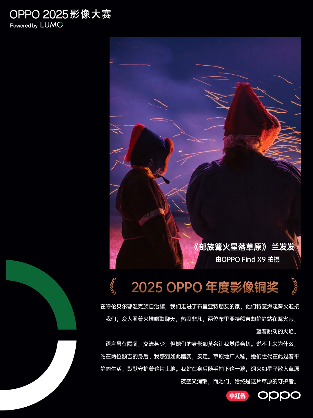 年度影像銀獎《克謝尼婭》,是攝影師荒草通過OPPO Find X8 Ultra的長焦鏡頭在街頭捕捉到的瞬間,評委Tina給出了評價:“這幅作品就是藝術(shù)。要創(chuàng)作出能打動人心、激發(fā)人們情感共鳴的作品絕非易事。其關(guān)鍵在于攝影師的作品是否能夠平易近人,并且具有能夠傳遞真實情感的能力。”而年度影像銅獎《部落篝火星落草原》則是一幅使用OPPO Find X9拍攝的夜晚篝火照片,評委許闖認(rèn)為:“無論是煙霧修飾下背景的筆觸感,還是火苗運動構(gòu)成的無序線條,都讓這幅攝影作品猶如油畫一般,人物造型和構(gòu)圖也恰到好處,非常精彩的一張作品。”