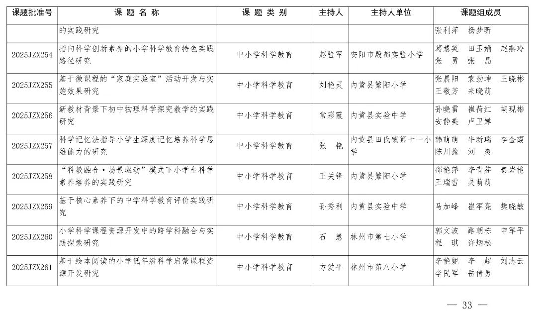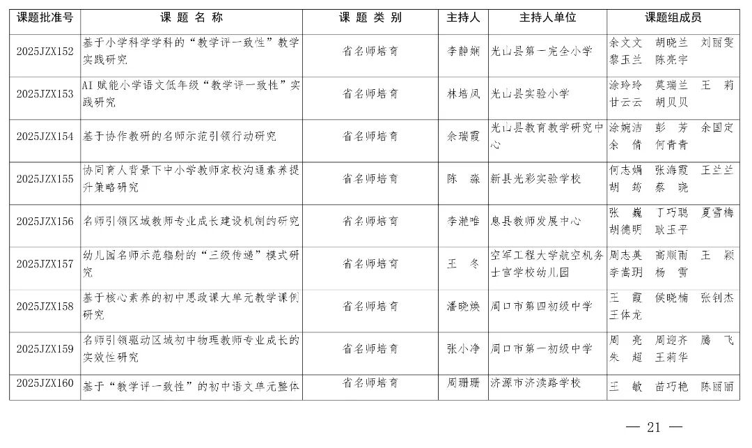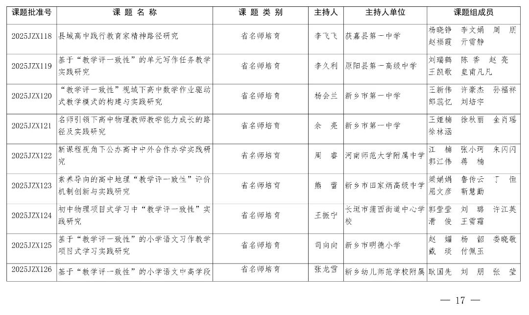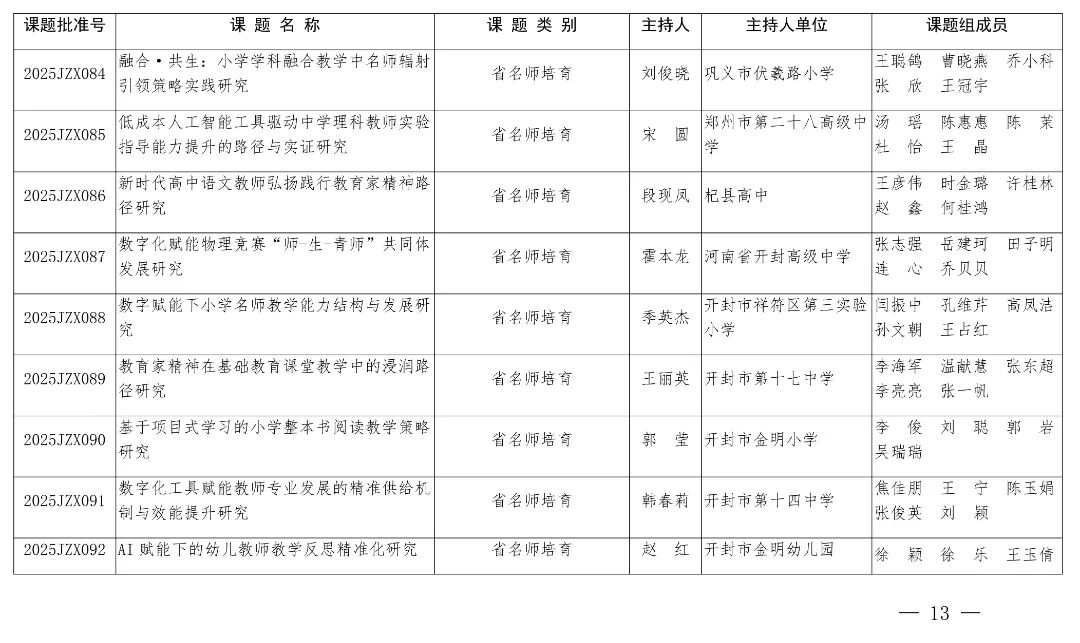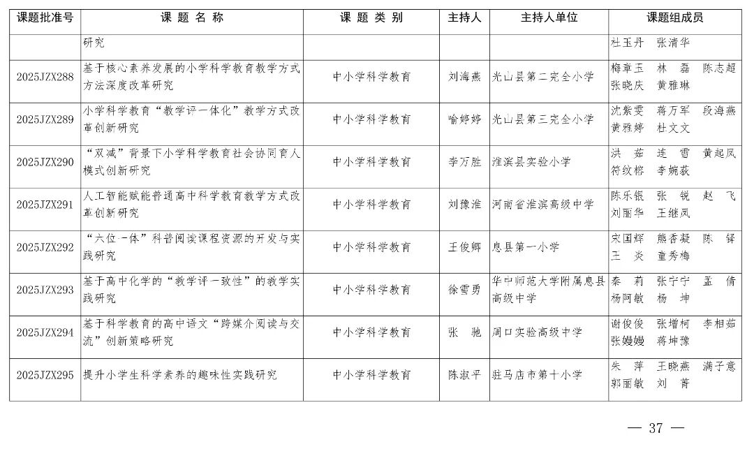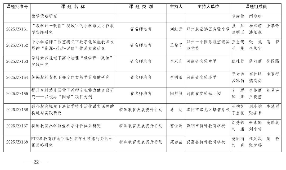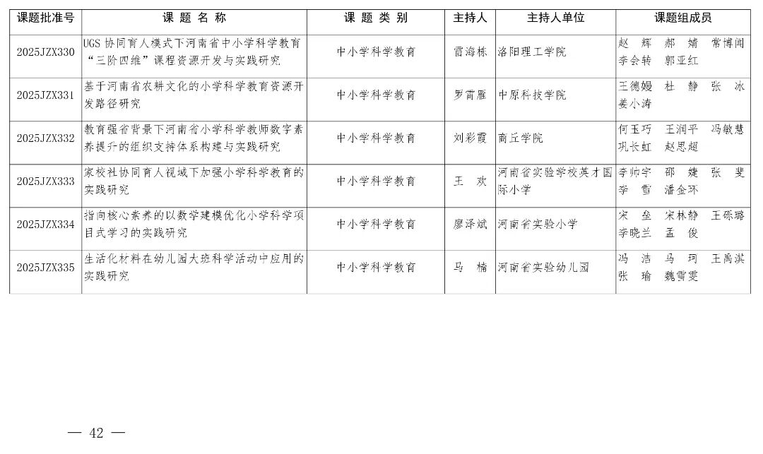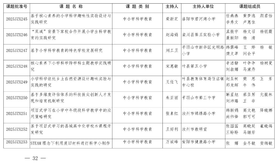 根據《河南省教育廳辦公室關于組織申報河南省教育科學規劃2025年度專項課題的通知》(教辦教科〔2025〕243號)要求,在逐級申報的基礎上,經過資格審查、專家評審、省教育科學規劃領導小組審核,確定2025年度專項課題335項,其中普通高中育人方式改革課題65項,特殊教育發展提升行動課題20項,省名師培育課題100項,中小學科學教育課題100項,校外教育培訓管理課題50項。現予公布。