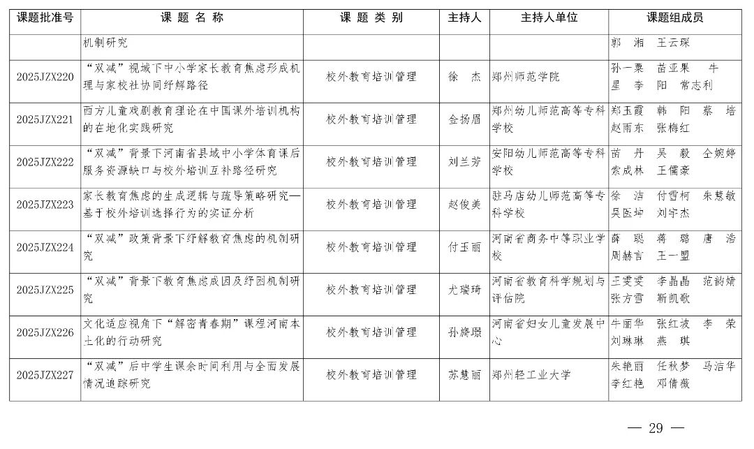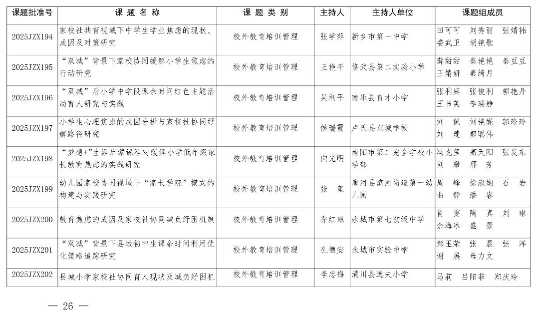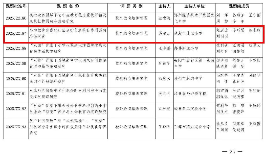 近日,河南省教育廳辦公室公布了河南省教育科學規劃2025年度專項課題立項名單,登封市北區小學校外教育培訓管理課題:《小學教育焦慮的歸因分析與家校社協同減負路徑研究》入選。以下是通知全文: