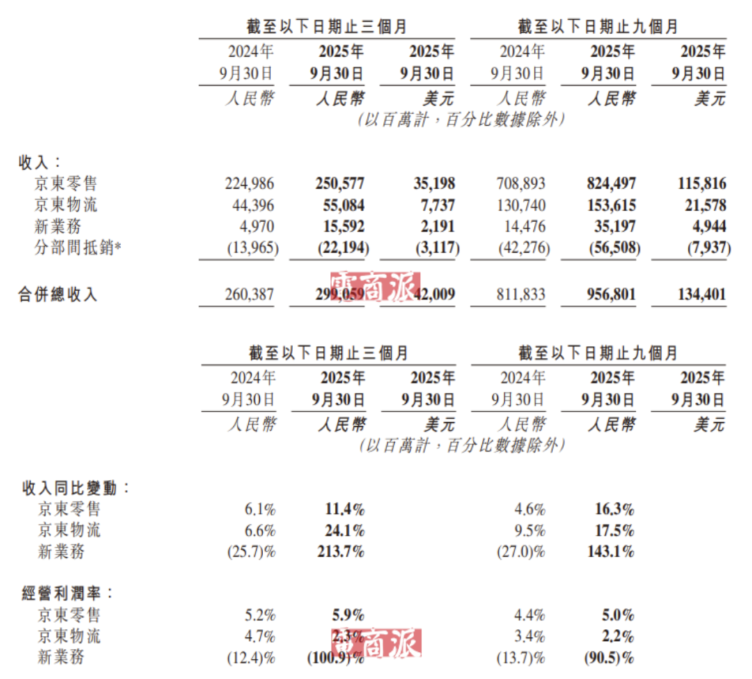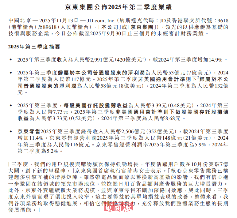 相關財報顯示,京東第三季度總收入2991億元,同比增長14.9%,連續第四個季度實現雙位數增長;集團凈利潤為53億元,同比有所下滑,主要源于對以京東外賣為代表的新業務以及國際業務的戰略性投入,并非經營不善的信號。