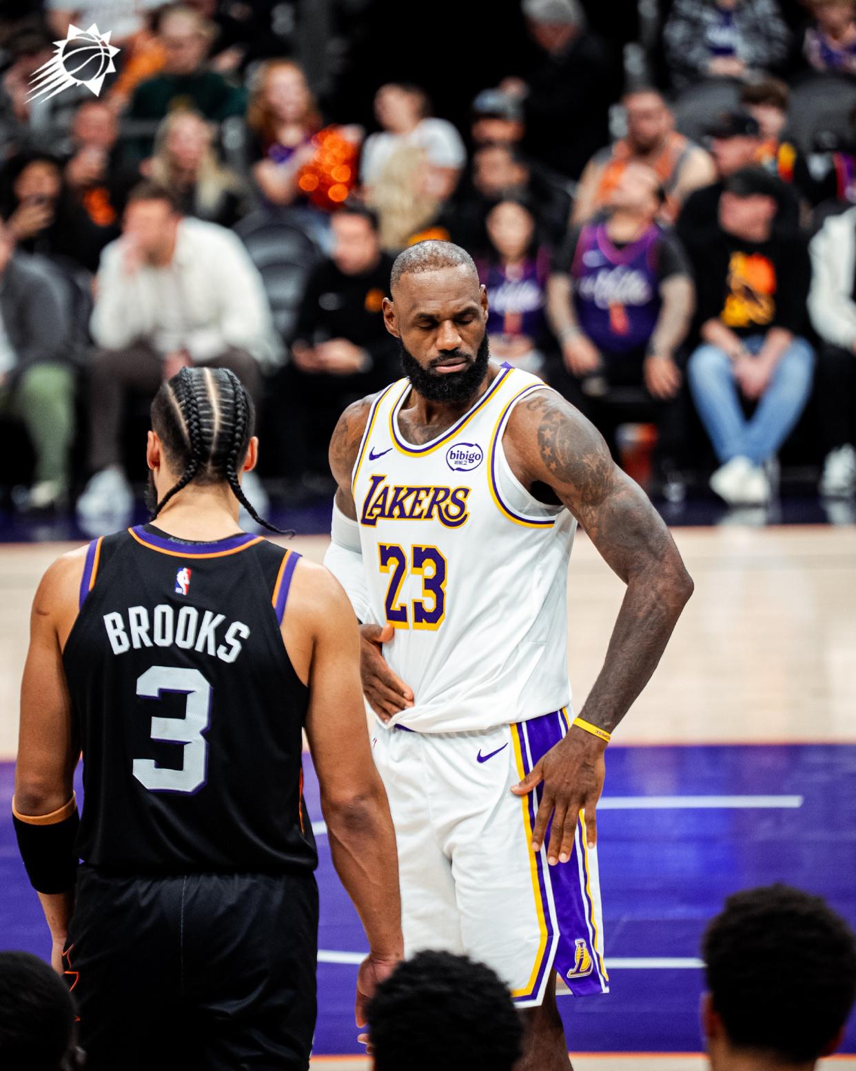 湖人連續外線打鐵,馬克威廉姆斯暴扣,東契奇3罰全中,阿倫暴扣。艾頓補籃得手,布克連投帶罰得到4分還以顏色,東契奇2罰全中,拉拉維亞上籃打進,湖人緊咬比分。兩隊繼續提升防守強度,均陷入了得分困境,東契奇2罰全中,拉拉維亞搶斷后助攻海斯隔扣打成了2+1,詹姆斯上籃得分。拉拉維亞大帽布克,布克封蓋拉拉維亞還以顏色,雷迪克挑戰判罰失敗,太陽連續外線打鐵,海斯2罰1中,文森特轟進遠投,湖人打出了15比0的攻勢。第3節打完,紫金軍團以86比77領先,菲尼克斯單節15比24落后。