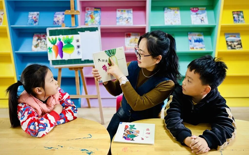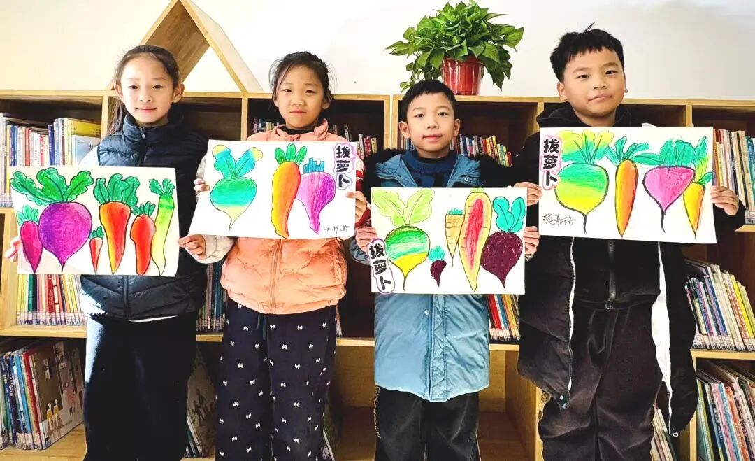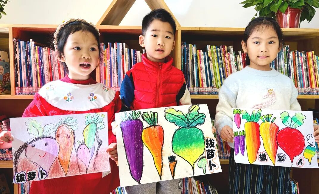 活動以經典繪本《拔蘿卜》的共讀分享為開端,館員通過生動講述與情景互動,引導孩子們理解故事中團結協作的主題。隨后進入創意手工環節,孩子們在指導下用畫筆描繪心中的“大蘿卜”,并動手制作相關主題手工作品。現場創作氛圍活躍,一幅幅充滿童趣的畫面展現出孩子們豐富的想象力與創造力。
