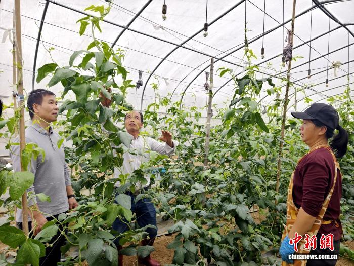 圖為農藝師在大棚里查看豆角苗生長情況。朱汝芳 攝