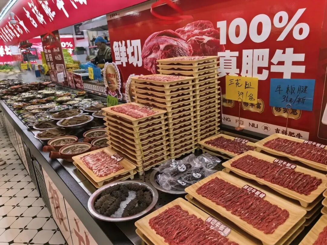 此外,各類鮮切牛肉、鐵板燒、蔬菜等產(chǎn)品陳列在開放式檔口一覽無余。