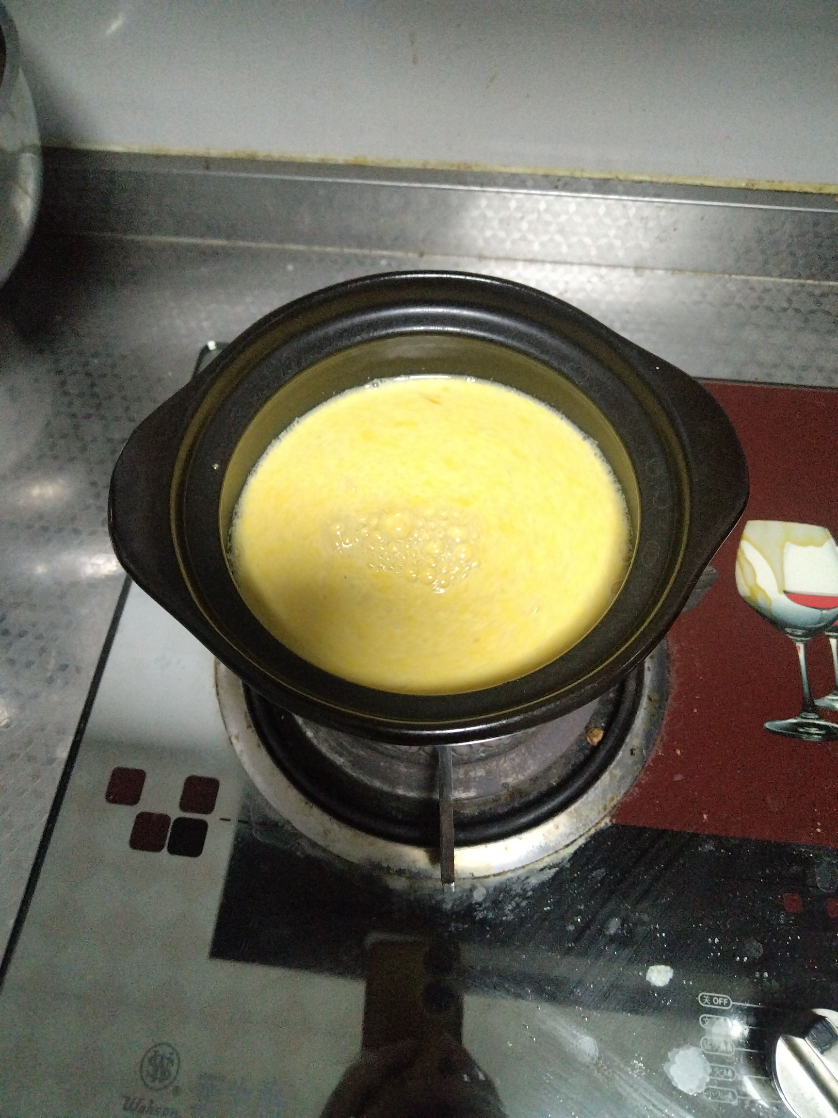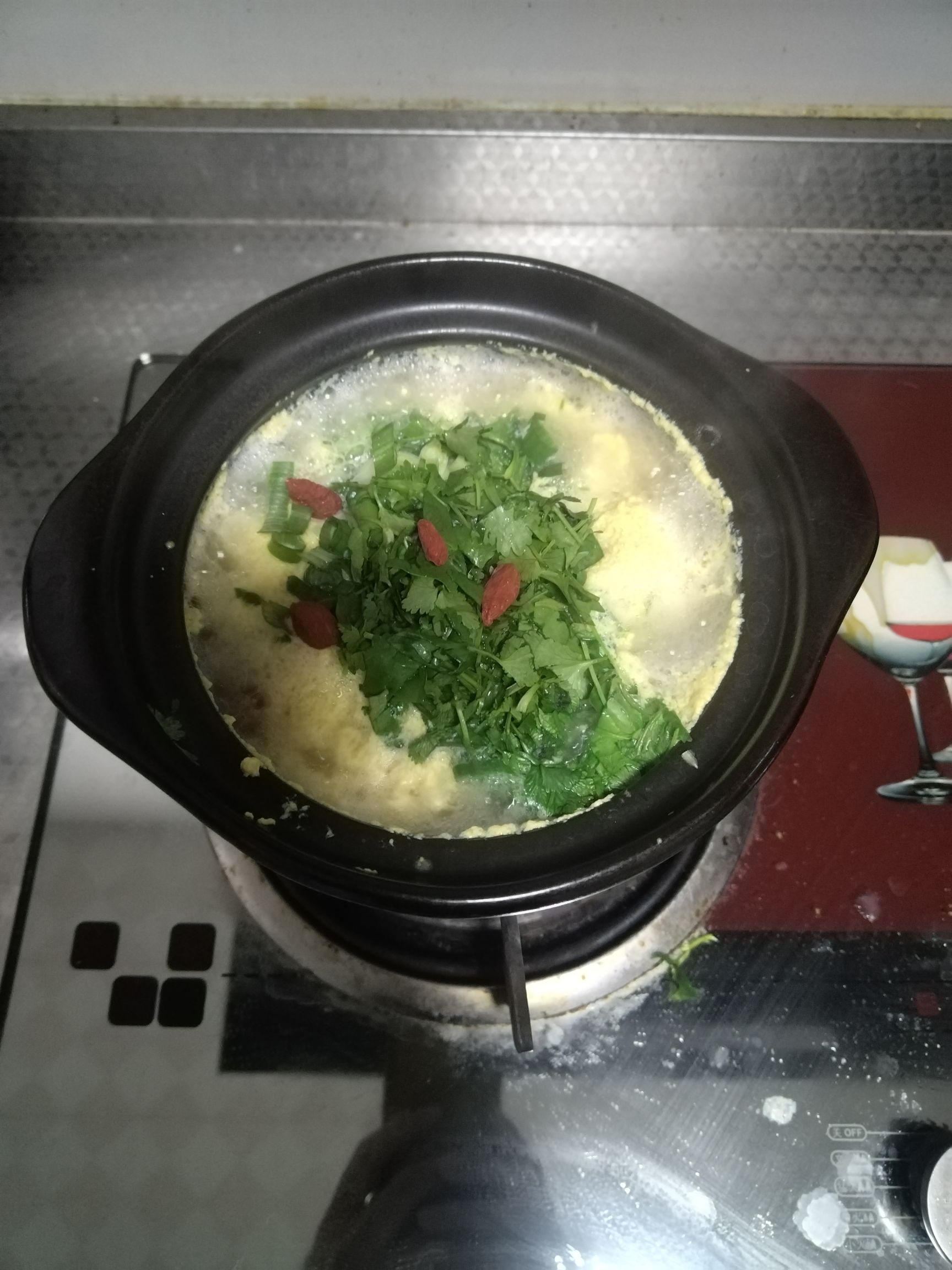 第一步,我找來了相關食材和配料。這其中包括雞蛋、香菜還有小蔥等,先把這些主料和配料找齊了,切盤備用。接下來就是第二步,砂鍋添水燒上,水里放少量鹽、雞粉或者雞精。第三步是準備四五枚雞蛋的,一起打在碗里,然后用筷子攪拌均勻。第四步也是最后一步,在即將燒開的水里倒入攪拌均勻的蛋液,然后用攪拌勺不停在鍋里攪拌著防止粘鍋,這一步也火候很重要,燒個七八分熟就行,剩下的時間用砂鍋的余溫把鍋里的雞蛋焐熟。在燉熟的砂鍋里,再加入提前配好的小蔥、香菜,再放點枸杞,滴入幾滴香油。最后一道色香味俱全的砂鍋燉雞蛋就做好了。