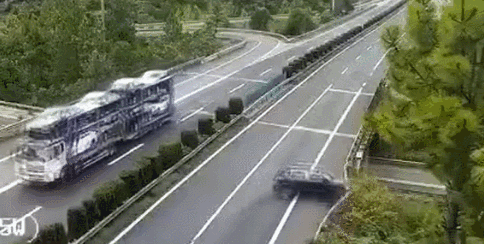 ▲ 黑色轎車在高速公路上碰撞護欄,后排乘客未系安全帶被甩出后掉下高架橋。