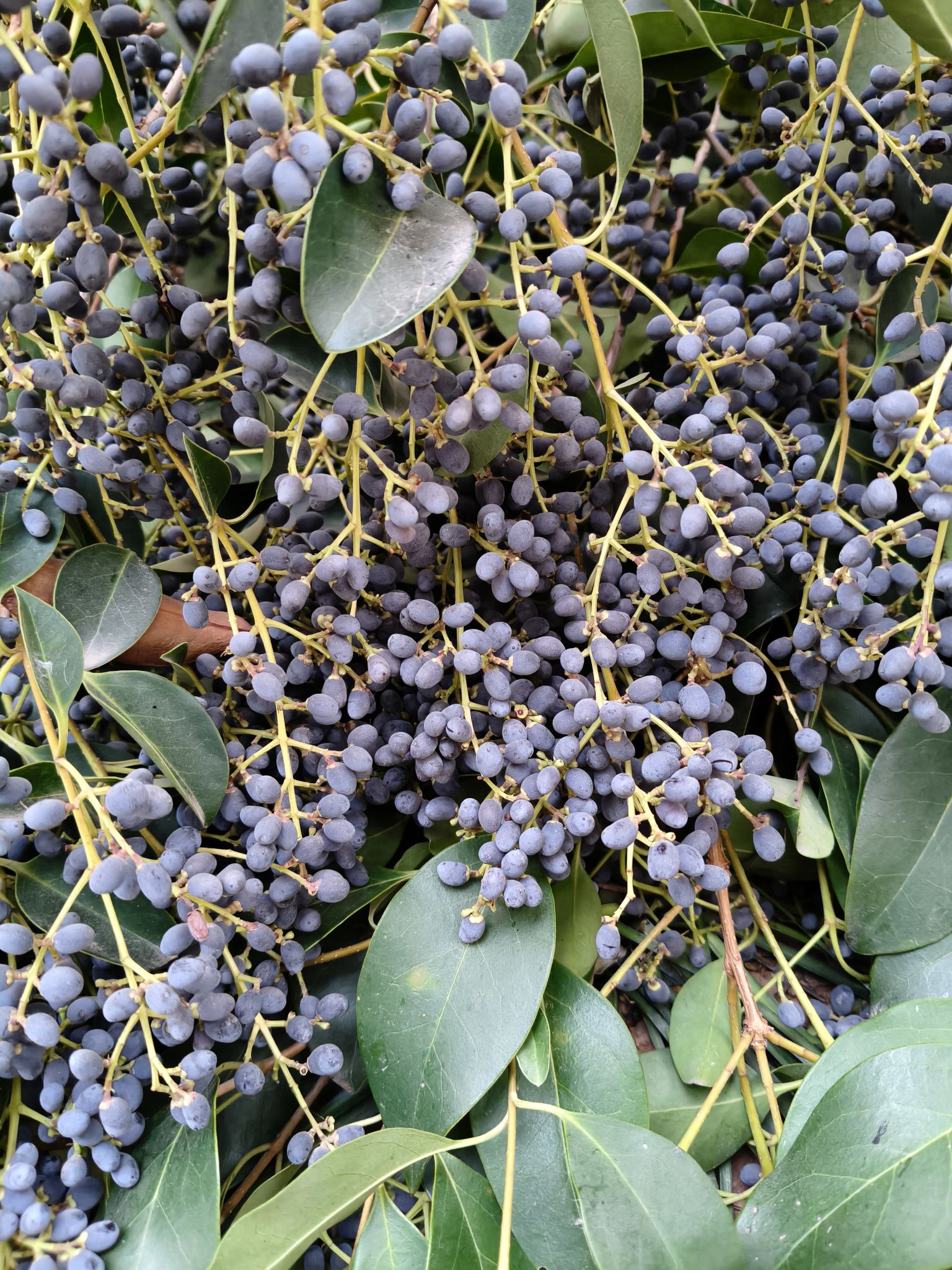 前幾天小區(qū)保潔阿姨和園藝師傅在修整花園,我指著樹上成串的女貞子給他們說(shuō)我想摘,可是夠不到。他們熱情的幫我剪下來(lái)許多果子飽滿稠密的,像紫葡萄一樣的,并且指導(dǎo)我怎么用手掰,不要用剪刀剪,用剪刀手會(huì)磨泡。不到二十分的時(shí)候我摘了兩大袋。