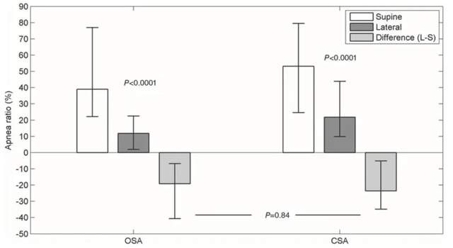 參考資料 [4]:以阻塞性睡眠呼吸暫停(OSA)和以中樞性睡眠呼吸暫停(CSA)為主的患者在仰臥位(空心柱)和側臥位(深色柱)時的呼吸暫停比率(AR)。淺色柱代表側臥位與仰臥位之間的差異。