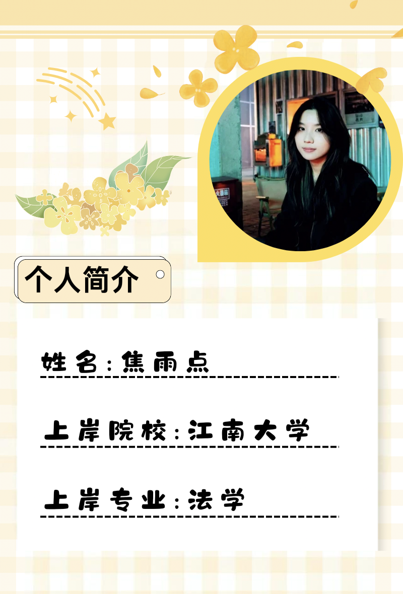 我是2021級法學專業的焦雨點,現在是江南大學法學專業的一名研究生。