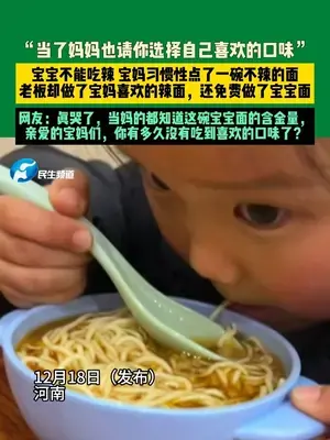 12月18日(發(fā)布)河南,“當(dāng)了媽媽也請你選擇自己喜歡的口味”寶寶不能吃辣 寶媽習(xí)慣性點了一碗不辣的面 老板卻做了寶媽喜歡的辣面,還免費做了寶寶面 網(wǎng)友:真哭了,當(dāng)媽的都知道這碗寶寶面的含金量,親愛的寶媽們,你有多久沒有吃到喜歡的口味了?(@溫縣藝閣裝飾?玲玲℡? )