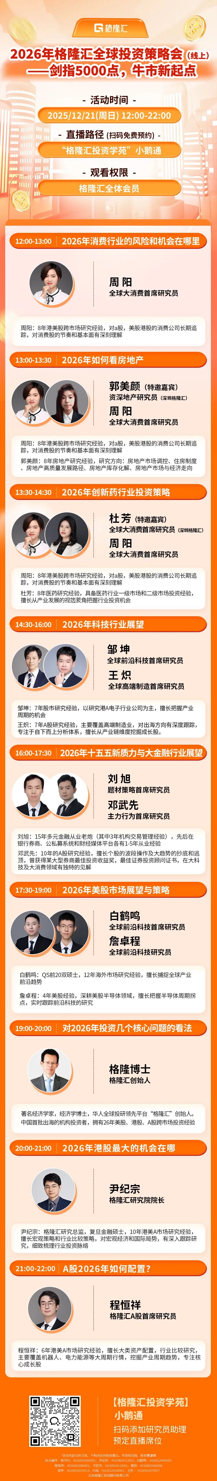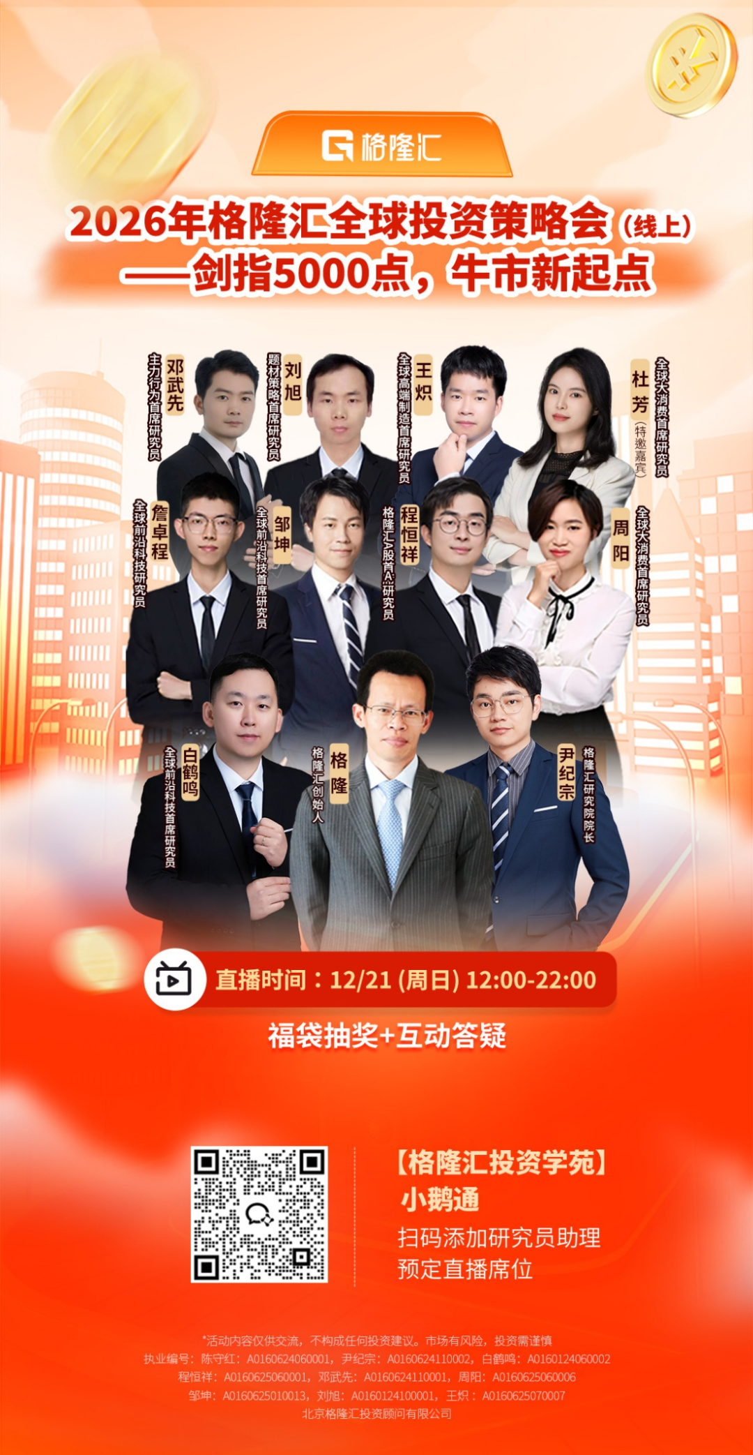 2025年12月21日(本周日),格隆博士將親自帶領格隆匯研究院各位首席研究員,通過線上方式重磅開啟“2026年格隆匯全球投資策略會——劍指5000點,牛市新起點”。
