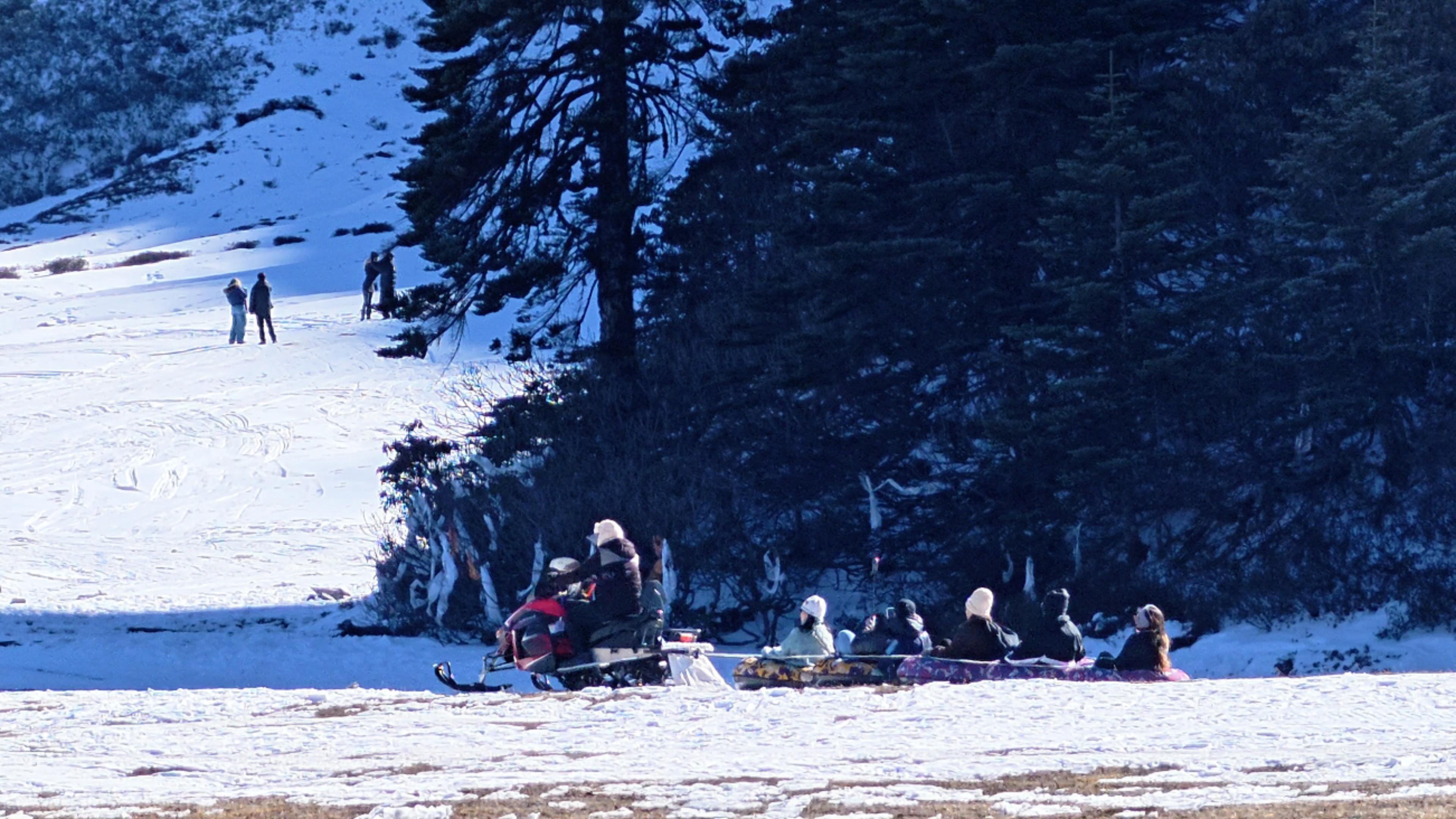 那是雪地摩托,鋼鐵的野獸,馱著艷紅的、充氣飽滿的“甜甜圈”——一種橡膠制成的巨大圓圈坐墊。領(lǐng)隊(duì)的藏族小伙扎西,臉頰是高原陽光烙下的酡紅,笑容比齒輪間的陽光更亮:“來!坐上‘蓮花寶座’,風(fēng)是甜的,雪是飛的!”