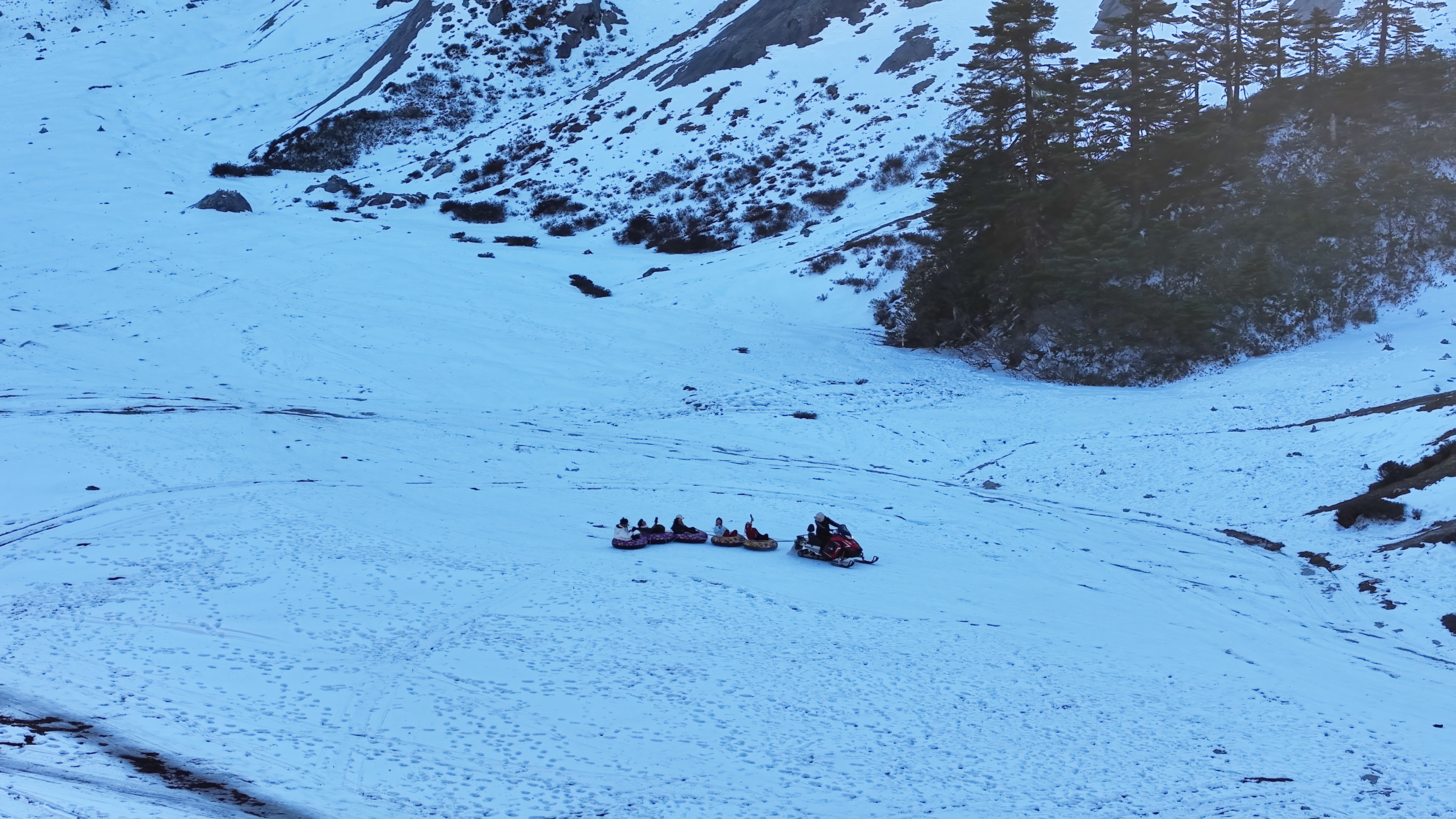 “抓緊了!”扎西回頭大喊,隨即又是一個(gè)急轉(zhuǎn)。我所在的“甜甜圈”瞬間橫移、漂移,像一片被狂風(fēng)吹落的紅色花瓣,失控地旋舞。世界在視線里顛簸、傾斜——肅穆的雪山、澄澈的藍(lán)天、濺起的雪霧,旋轉(zhuǎn)攪拌成一幅流動(dòng)的、令人眩暈的抽象畫。那一刻,思考停滯,只剩下最原始的、屬于孩童般的雀躍。我仿佛不是來“觀賞”這座圣山的,而是成了它廣袤冬衣上一粒滾動(dòng)的裝飾,一個(gè)被允許在它掌心短暫撒野的、快樂的塵埃。