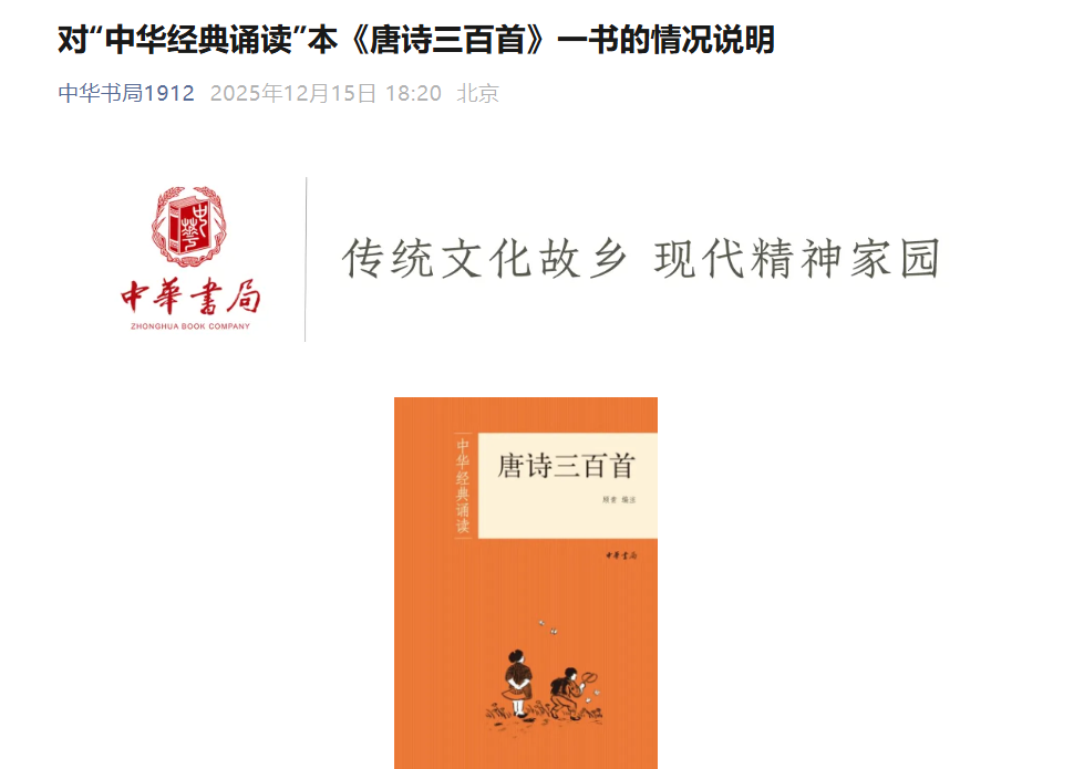 2025年12月2日、12月9日,讀者盛大林先生在個人微信公眾號里指出中華書局“中華經(jīng)典誦讀”本《唐詩三百首》(書號978-7-101-08686-7,2017年第7次印刷本)存在簡繁字對照錯誤。12月14日,署名“國文小夫子”的教育自媒體在視頻號轉(zhuǎn)述了相關(guān)內(nèi)容。我們高度重視,及時做了復查?,F(xiàn)說明如下: