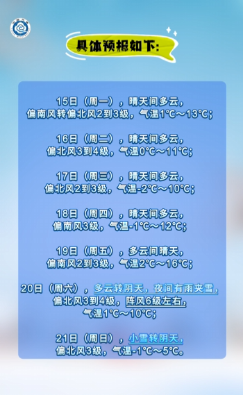 17日,晴天間多云,偏北風2到3級,最低氣溫-1℃~0℃,最高氣溫10℃~11℃