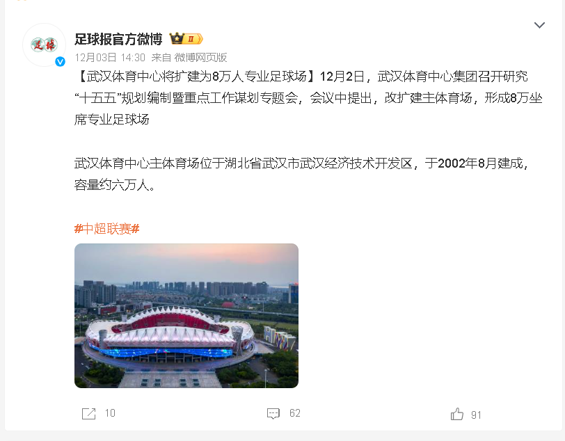 前幾年武漢可是全國(guó)足球一張名牌,擁有多支中超球隊(duì),特別是武漢三鎮(zhèn)還奪得中超冠軍,用遇神殺神,遇佛殺佛來形容一點(diǎn)也不為過,不僅男足厲害,他們的女足也很厲害,前不久武漢車谷江大還奪得亞冠冠軍,女足更是奪得多個(gè)級(jí)別的冠軍,這樣的城市,能不配擁有8萬(wàn)的大球場(chǎng)嗎?