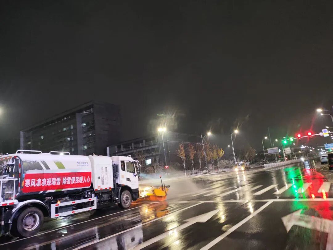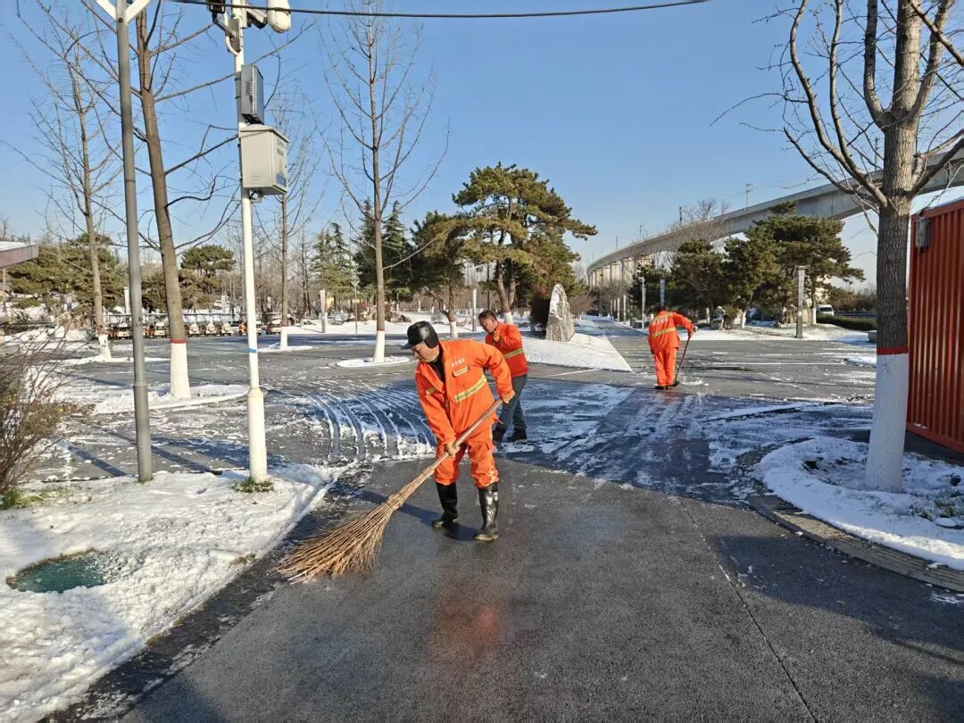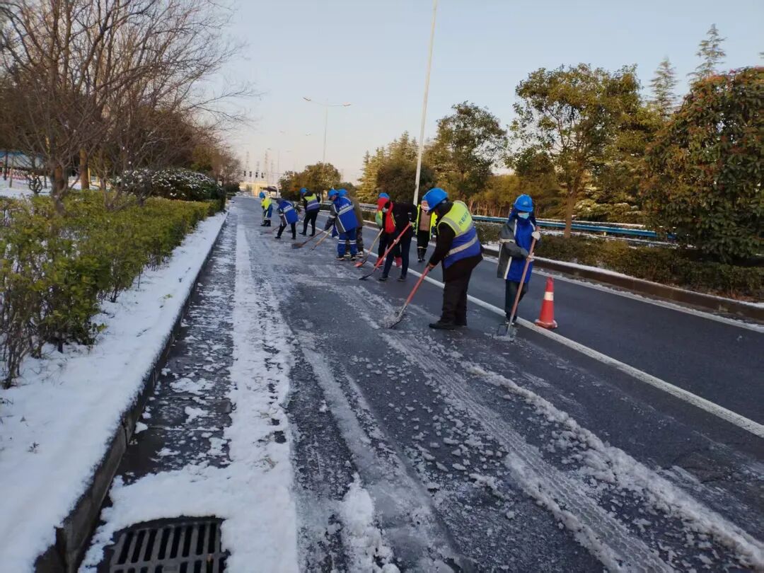 安排300余名工作人員對人行步道、綠化帶周邊散落積雪、雜物進行精細化清理,避免積雪消融后滋生衛生死角。同時密切關注天氣變化,針對次日可能出現的路面結冰風險,將巡查頻次加密至每2小時1次,對3座高架橋、28條坡道等重點路段開展專項除冰作業,確保道路交通安全。