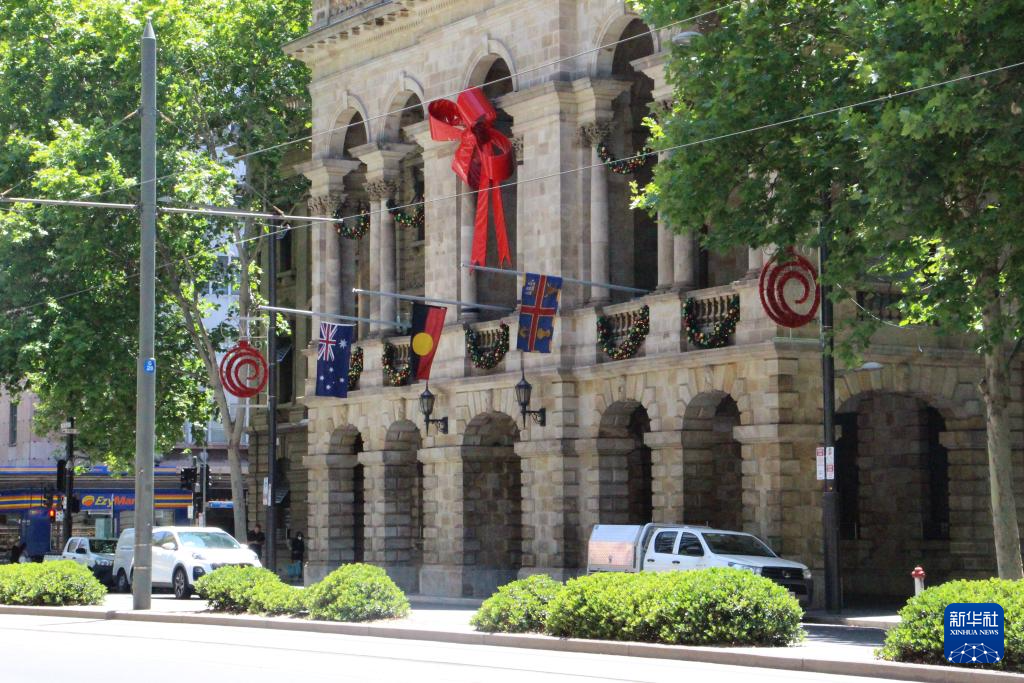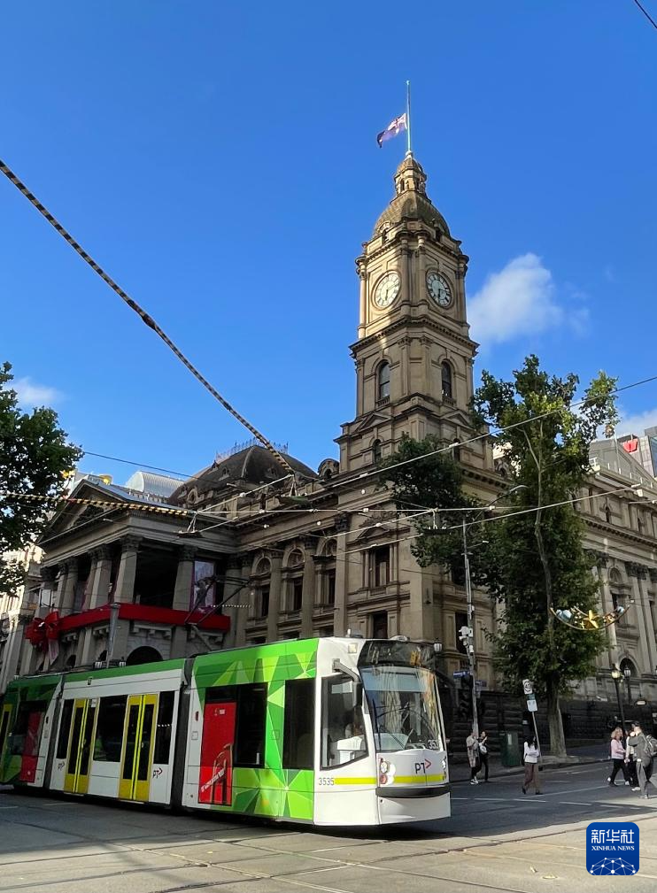 12月15日,在澳大利亞墨爾本,位于市中心的墨爾本市政廳降半旗,悼念悉尼邦迪灘槍擊事件遇難者(手機(jī)照片)。