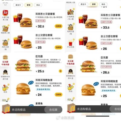 根據消費者曬出的訂單截圖,其中多款早餐卡套餐漲幅在0.3元~1元不等,培根芝士雙牛堡、安格斯、巨無霸等在內的多款經典主食套餐,價格均上漲了1元。小食方面,麥樂雞、那么大雞排等小食價格也同步上調了1元,麥麥脆汁雞、中份薯條等則上調0.5元。被消費者戲稱為窮鬼套餐的“1+1隨心配”基礎價格維持13.9元起,但若選擇雙層吉士堡,則需多加1元。