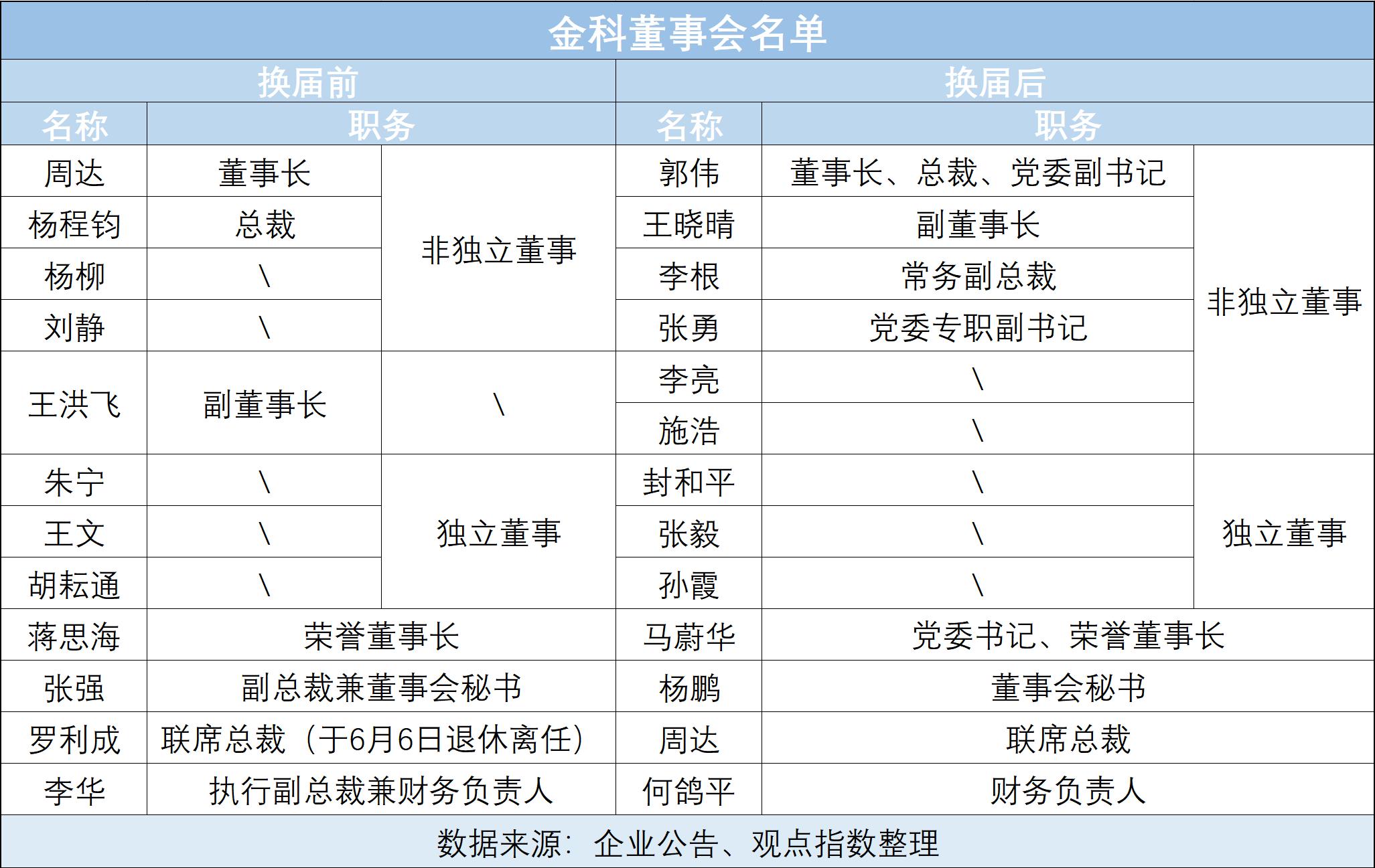 具體來看,郭偉獲任金科股份董事長、總裁、黨委副書記,王曉晴任副董事長,周達為聯席總裁,李根為常務副總裁,張勇為黨委專職副書記,楊鵬為董事會秘書,何鴿平為財務負責人。