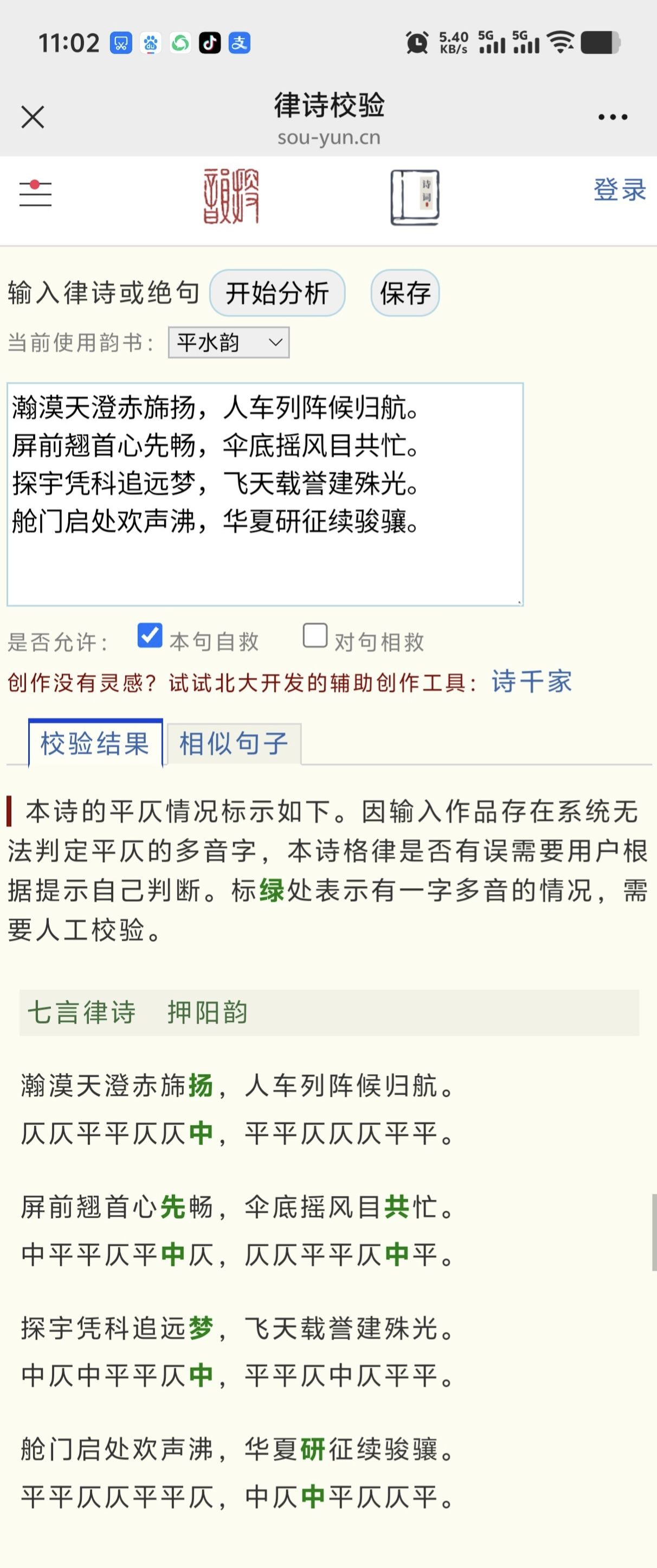 首聯(lián)“瀚漠天澄赤旆揚(yáng),人車列陣候歸航”開篇鋪展壯闊底色,“瀚漠天澄”以“瀚漠”的廣袤與“天澄”的清朗,勾勒出凱旋之地的遼遠(yuǎn)澄澈,無絲毫冗余,盡顯天地開闊;“赤旆揚(yáng)”(紅旗飄揚(yáng))與“人車列陣”則注入人文莊重感,紅色旗幟既是家國(guó)符號(hào),又為蒼茫瀚漠添上熾熱亮色,列陣等候的場(chǎng)景既體現(xiàn)對(duì)航天英雄的敬仰,又暗藏民族凝聚力,讓自然之壯闊與人文之莊重完美契合。