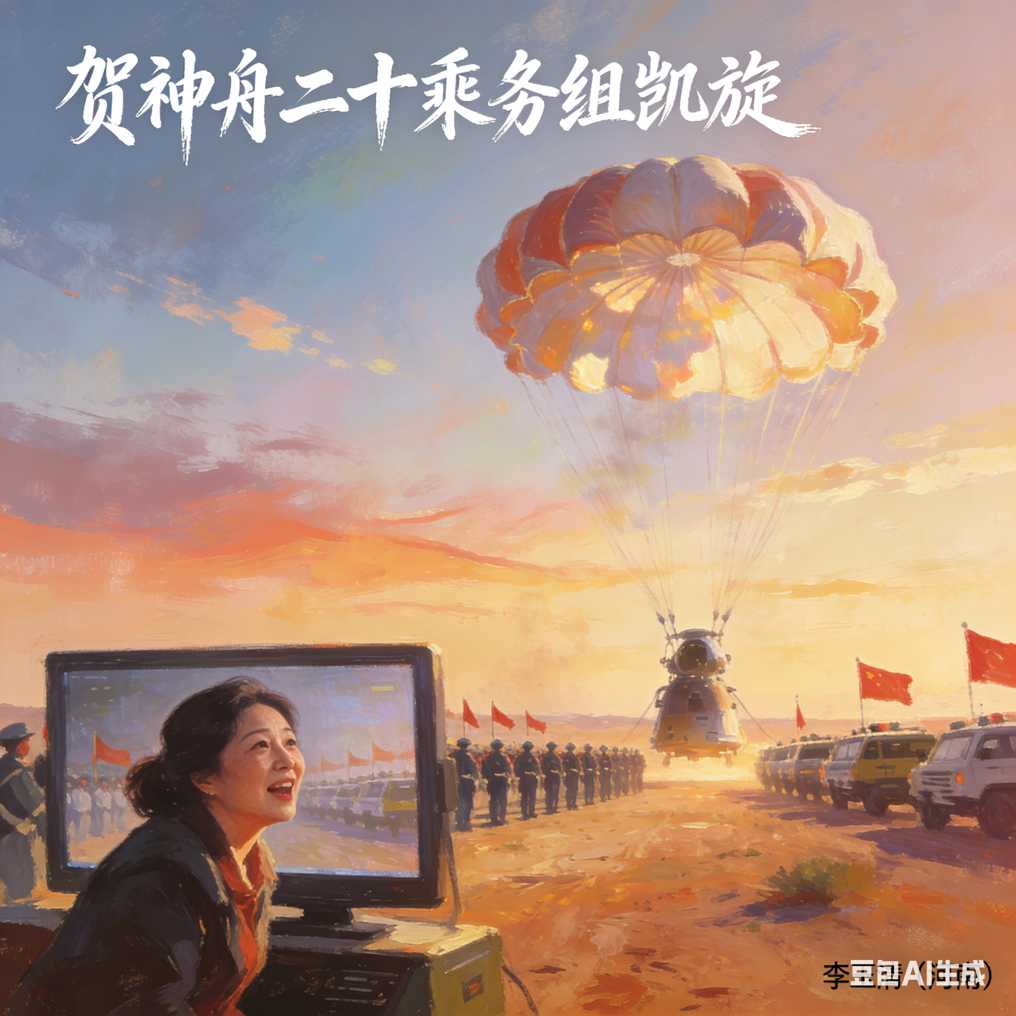 頷聯(lián)“屏前翹首心先暢,傘底搖風(fēng)目共忙”視角巧妙切換,從現(xiàn)場(chǎng)的“傘底搖風(fēng)”(返回艙降落傘晃動(dòng))延伸至全國(guó)的“屏前翹首”,將迎接者的急切目光與億萬觀眾的期盼之心相連。“心先暢”寫情感的提前釋放,“目共忙”狀目光的聚焦追尋,一內(nèi)一外、一虛一實(shí),讓場(chǎng)景從單一的迎歸現(xiàn)場(chǎng),拓展為全民共情的壯闊圖景,既見個(gè)體的細(xì)膩感受,更顯民族的集體熱忱。