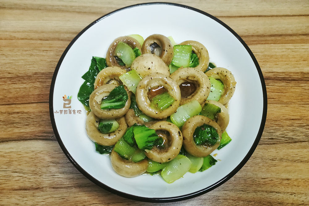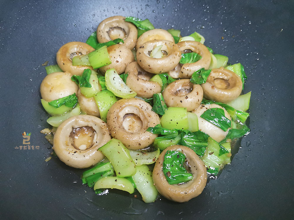 4、接著再加點蒜粒進去,青菜放里邊,與口蘑一起炒,很快就塌生了,補點鹽,咸淡調整適宜,再加點黑胡椒,這是非常增香提味的一步。然后就可以出鍋了,味道非常鮮美。