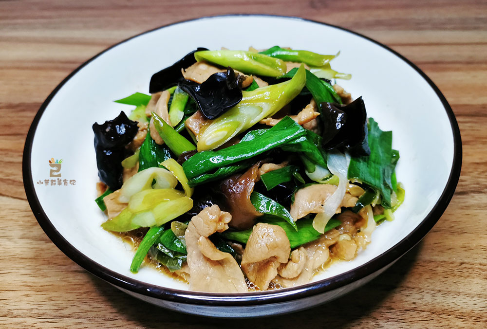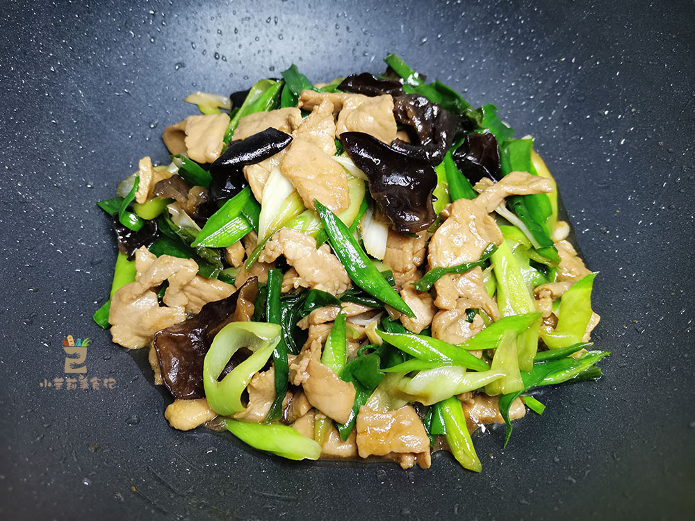 4、鍋里放油燒熱,肉片下鍋,扒拉幾下,變色成型時就成出來。木耳和青蒜都倒進去,馬上調些生抽,蠔油,些許醋,快速炒一會兒。肉片再次倒回去,些許鹽下鍋,味道炒勻后裝盤。