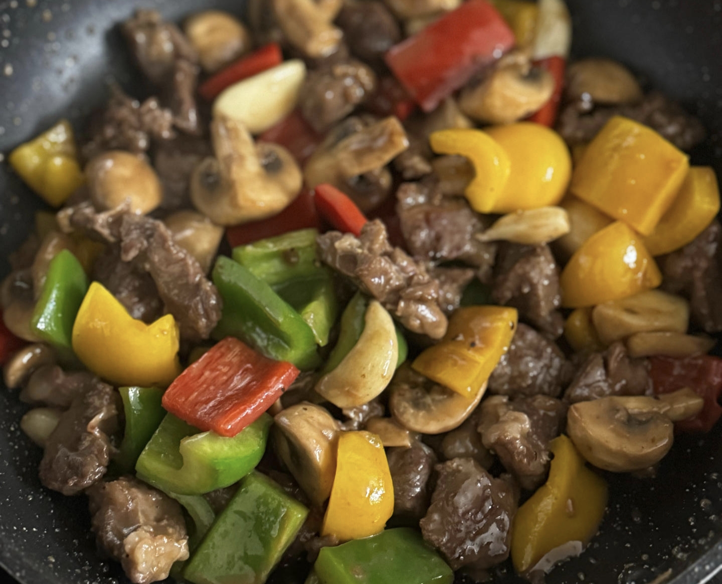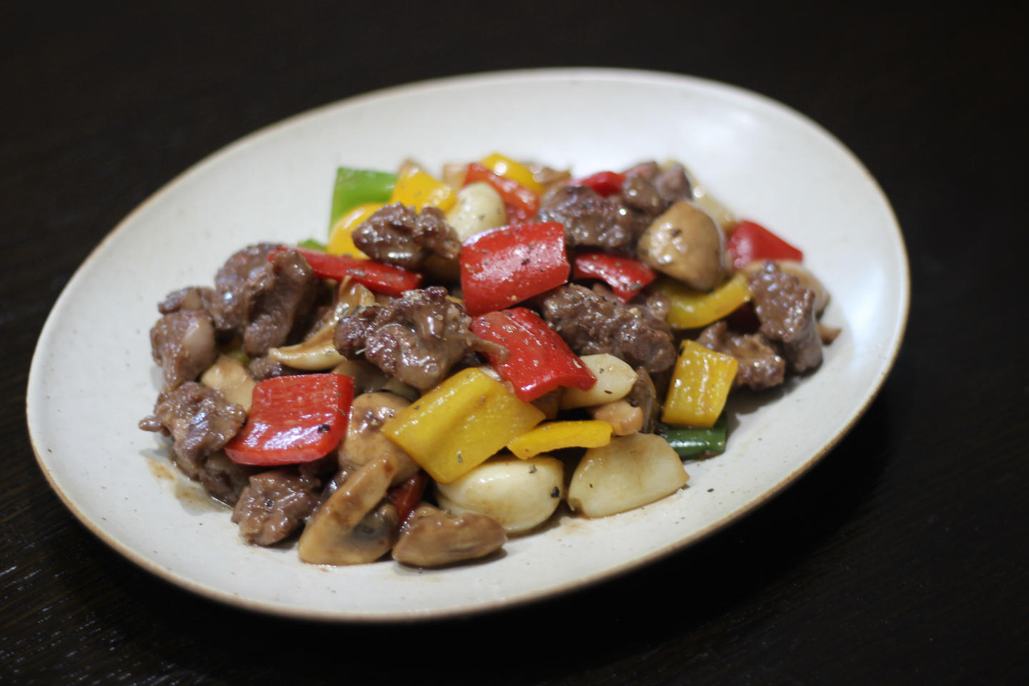 4、屆時把彩椒下鍋,與牛肉一起炒香,調些許蠔油,鹽,把調味料炒勻,裹到食物上,馬上裝盤。